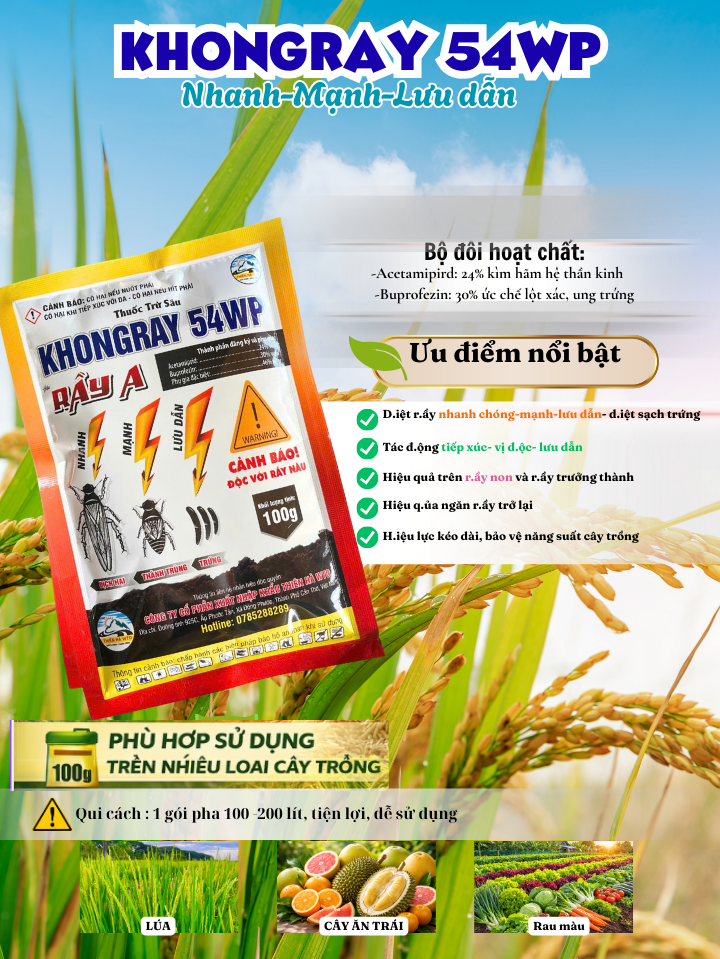 Trong quá trình canh tác lúa và nhiều loại cây trồng, rầy nâu là đối tượng gây hại nguy hiểm, làm suy yếu cây, vàng lá, cháy rầy và giảm năng suất nghiêm trọng. Để giúp bà con kiểm soát rầy hiệu quả, KHONGRAY 54WP ra đời với công thức đặc biệt giúp diệt rầy nhanh – mạnh – kéo dài hiệu lực.