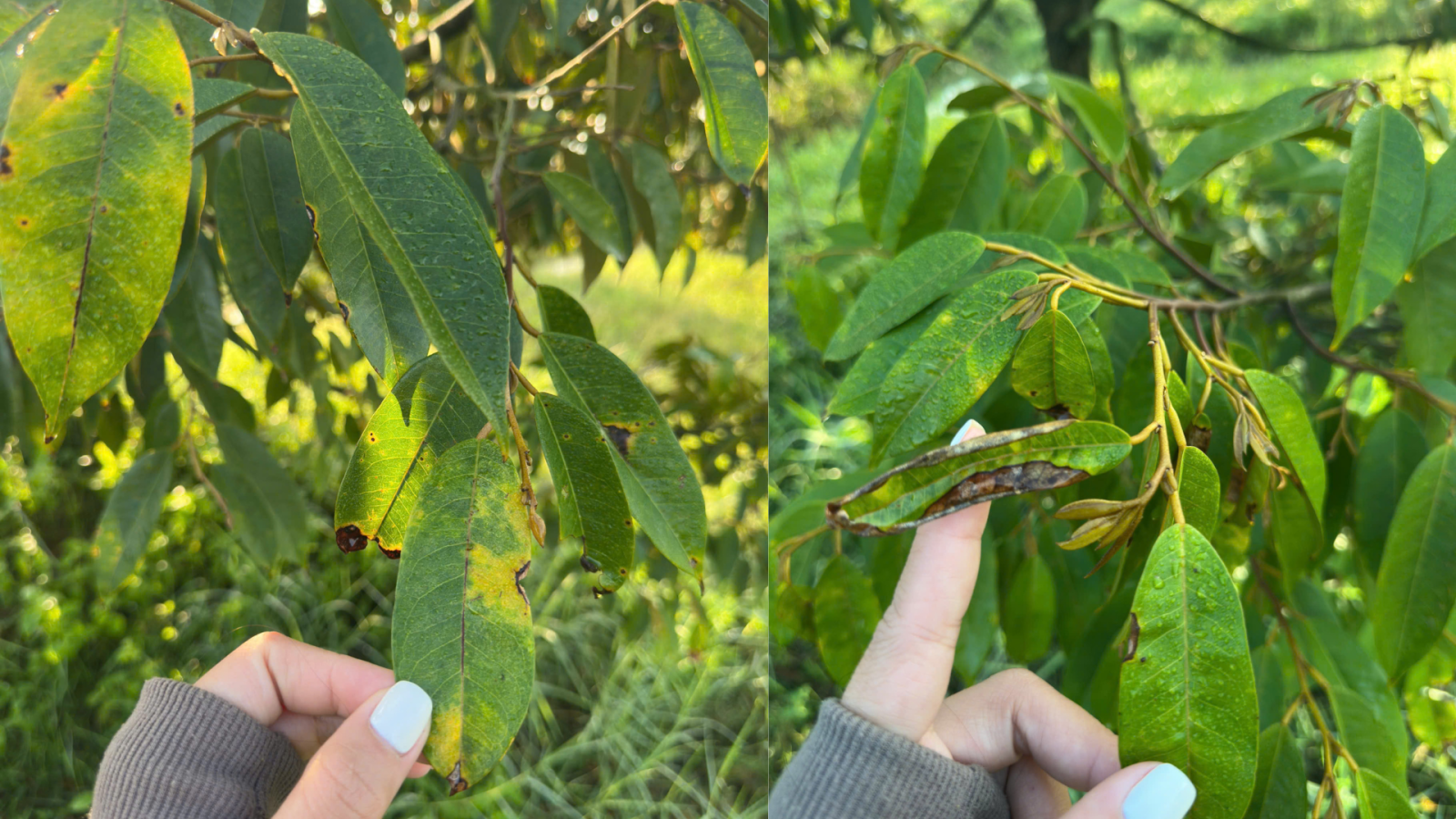 -Lá non bị chấm vàng li ti, sau đó chuyển nâu, mép lá cháy khô, cong lại, đọt non chùn lại, không phát triển, trường hợp nặng: lá rụng, cây suy yếu